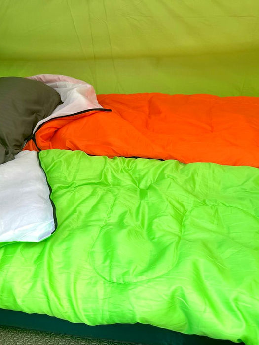 Protección impermeable, protector de piso, tapete, colchón de aire individual o doble, bolsa de dormir, almohada, *mini ventilador con luz integrada* & linterna recargable.